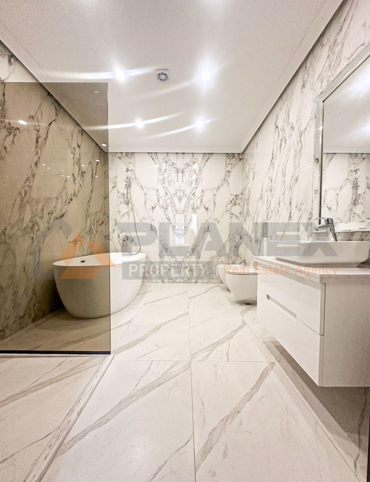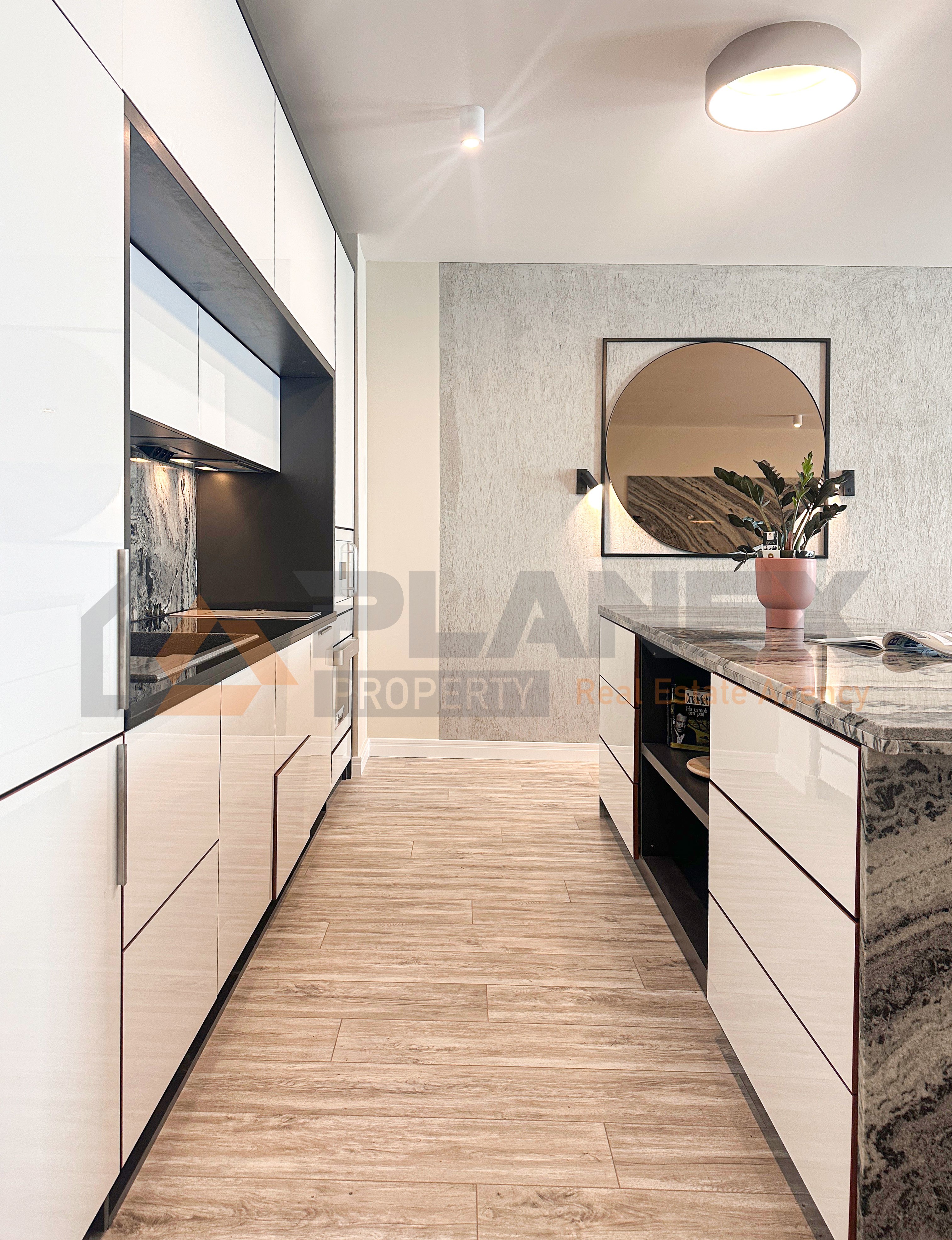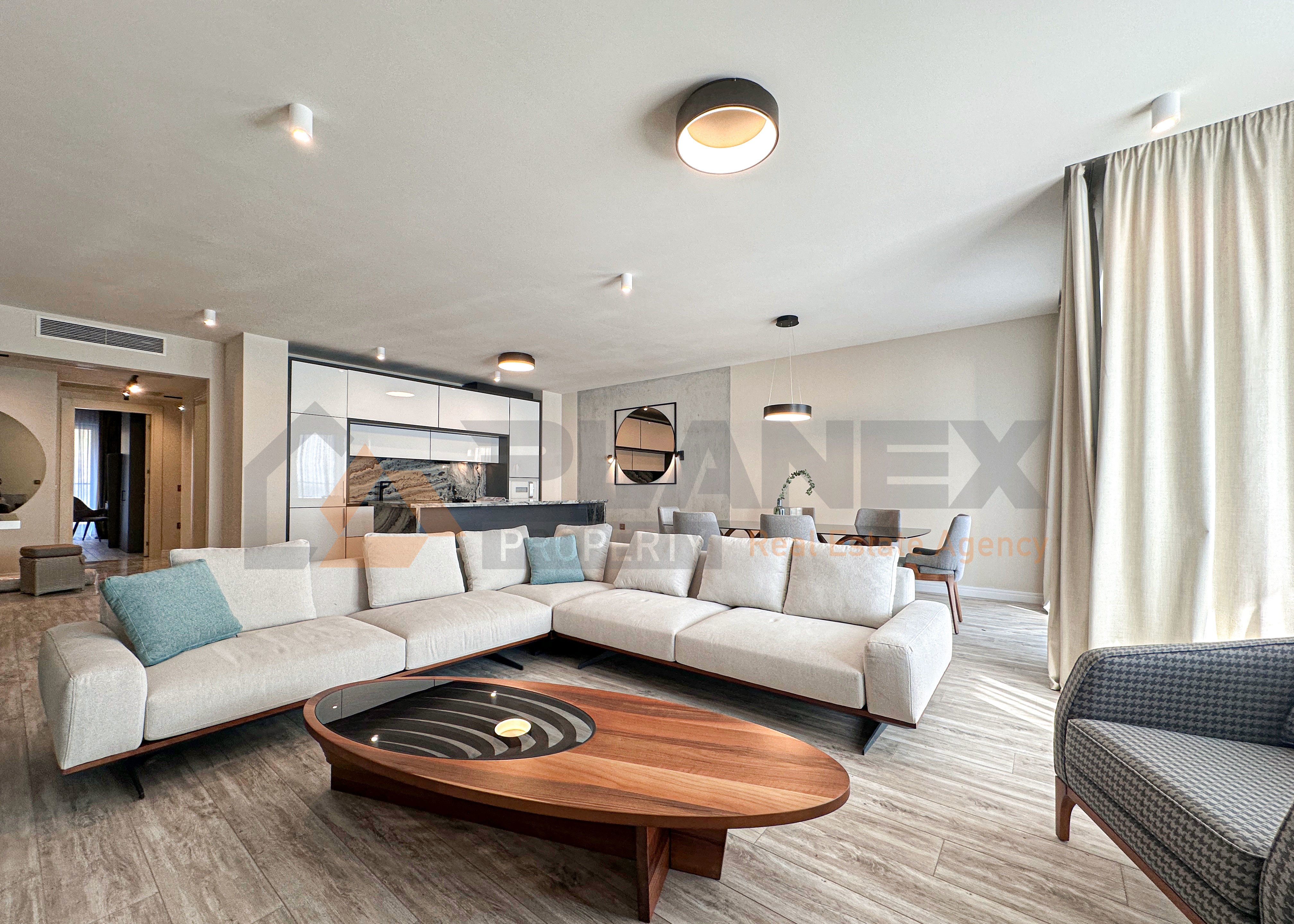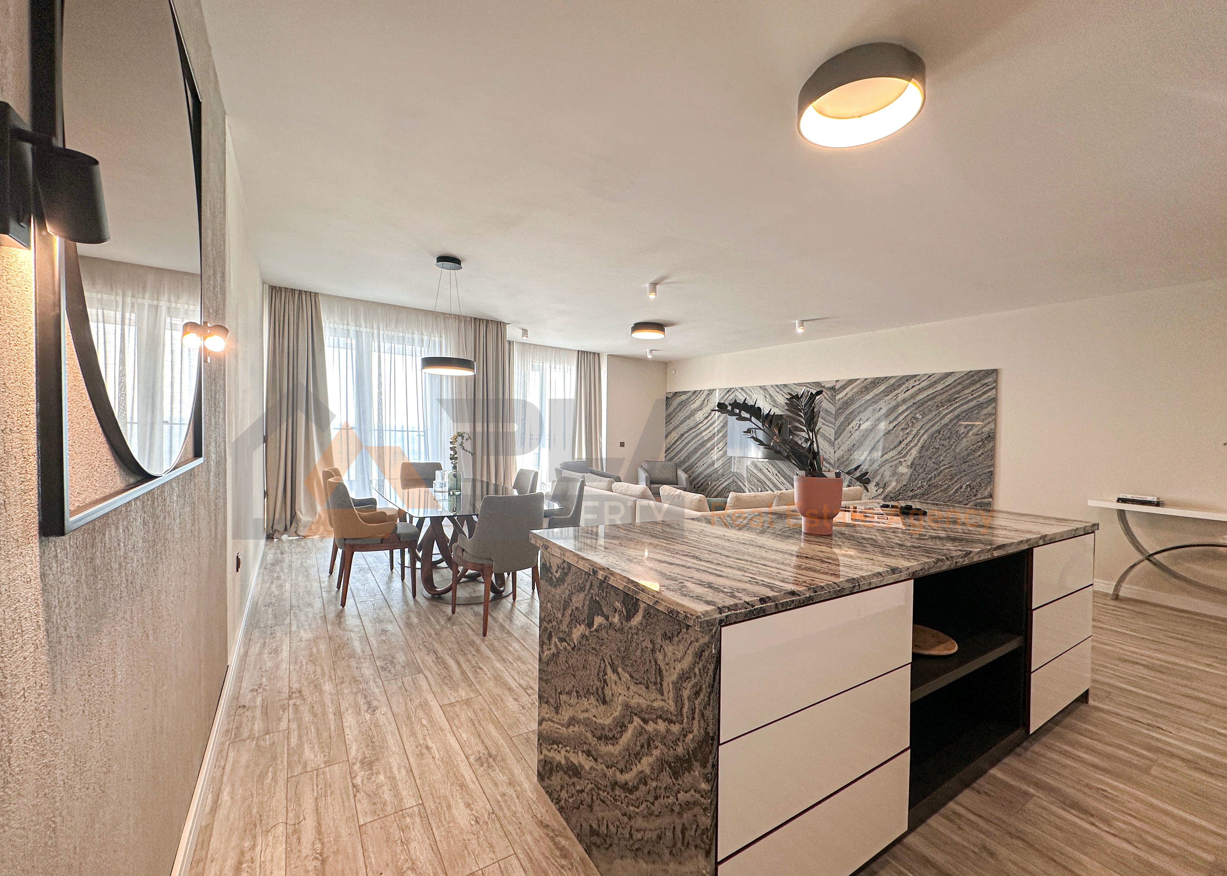 Предлагаме на Вашето внимание чисто нов прекрасен апартамент с две спални намиращ се в луксозен комплекс от затворен тип на първа линия, находящ се в к.к. СВ. св. Константин и Елена. Жилището е луксзно и модерно, проектирано от професионален дизайнерски екип, изпипано до най-малкия детайл, за да даде на своите обитатели максимамален уют и комфорт. Състои се от слънчева и просторна дневна с големина 54.18м2 и излаз към голям балкон и спираща дъха морска панорама, две спални с тераса, с големини съответно 18.22м2 и 20.56м2, едната от които разполага със собствена баня/тоалетна, отделно има още една баня/тоалетна, перално помещение и коридор. Отдава се дългосрочно, като е обзаведено и оборудвано с всичко необходимо за едно домакинство.
